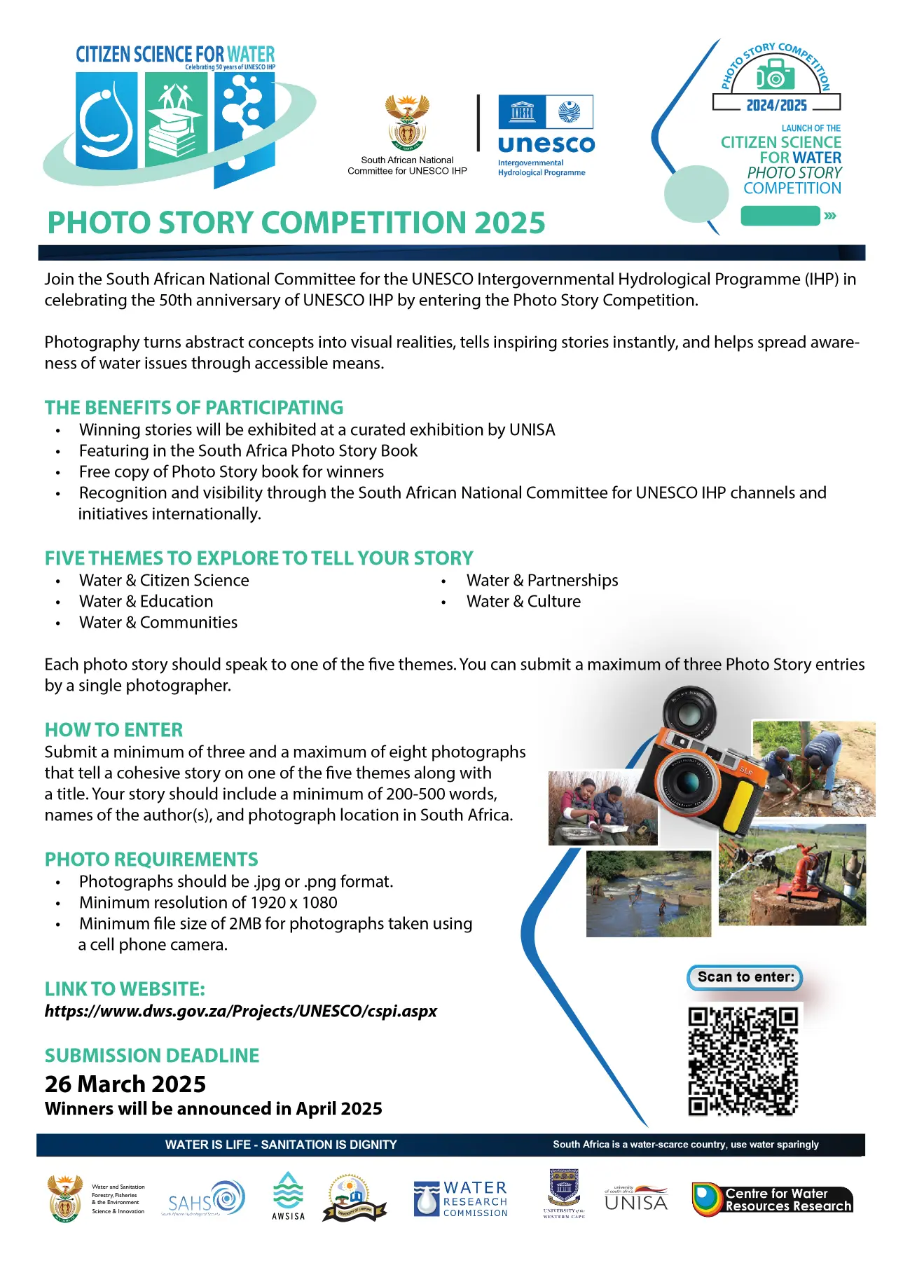 Celebrate UNESCO IHP’s 50th anniversary by entering the Photo Story Competition, highlighting water-related themes like citizen science, partnerships, education, culture, and communities. Submit 3-8 photographs with a 200-500 word story by 26 March 2025 for a chance to feature in exhibitions, a photo storybook, and gain international recognition. Visit the official website for guidelines and details: https://www.dws.gov.za/Projects/UNESCO/cspi.aspx